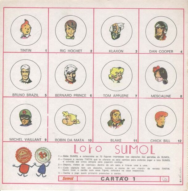 ans les années 70, le limonadier portugais "Sumol" lançait dans la version portugaise de Tintin magazine hebdo un jeu de loto vraiment original . En fait il s'agissait de collecter les capsules du soda orange ou ananas du fabricant qui contenaient à l'intérieur la reproduction des têtes célèbres des héros de BD de l'époque . Ces capsules numérotées prenaient places sur six cartons différents qui permettaient de jouer à une variante de jeu de loto ....