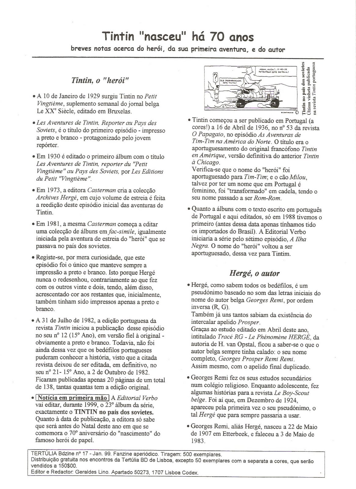 O #17 do fanzine Tertúlia BDzine de Janeiro de 1999 comemora o 70º aniversário do nascimento do Tintin com uma pastiche de Geral e Derradé e uma separata com a capa do primeiro álbum do Tintin e, no verso, breves notas acerca do herói, da sua primeira aventura e do autor.